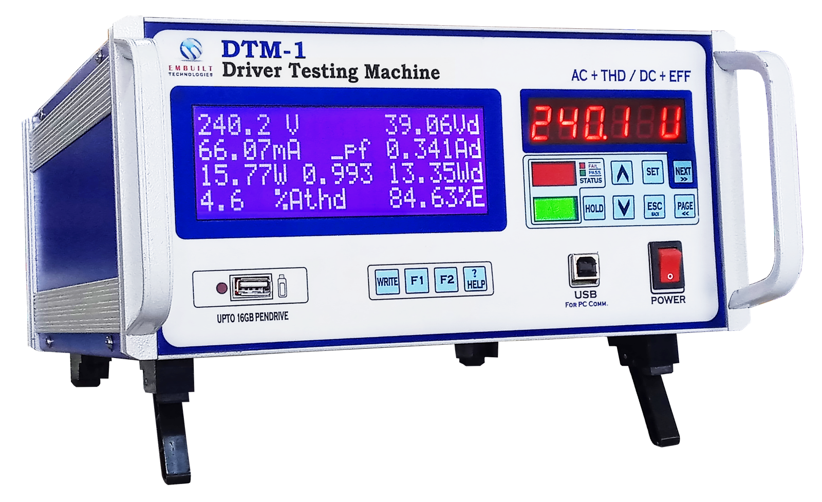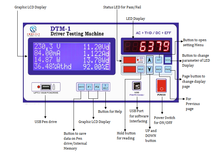 DTM-1 is an AC-DC converter testing instrument with harmonics. It is made to increase the quality of LED drivers/SMPS/AC-DC Converters at production. It contains a big Blue moon display to show AC parameters (left) and DC parameters (right) on the main page. The USB port and Pen-drive port are also optically isolated with an internal circuit for the safety of the user/operator. it also contains a Bar Code facility for fast and easy testing. and generate datasheet with barCode number and measured parameters. DTM has a facility to select the current range to make more accurate testing of the products. The current range started at 1mA to select 10Amp range.